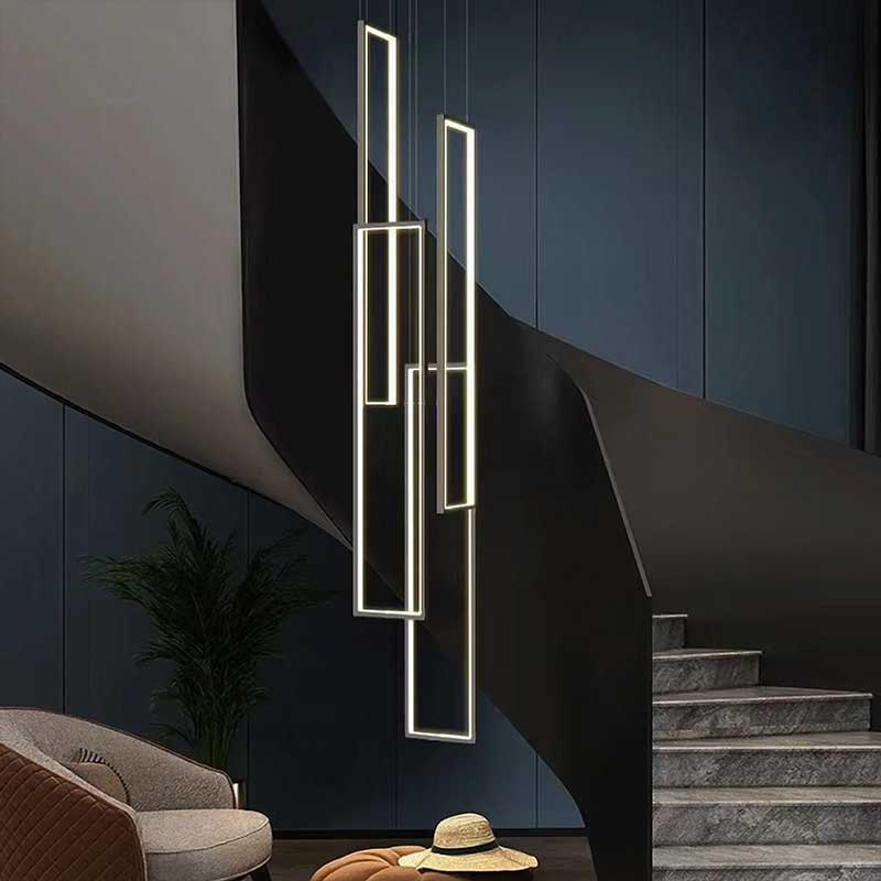 Tems is an ultramodern rectangular stairwell chandelier that embodies a minimalistic and stylish elegant look. Carefully designed and crafted from premium materials