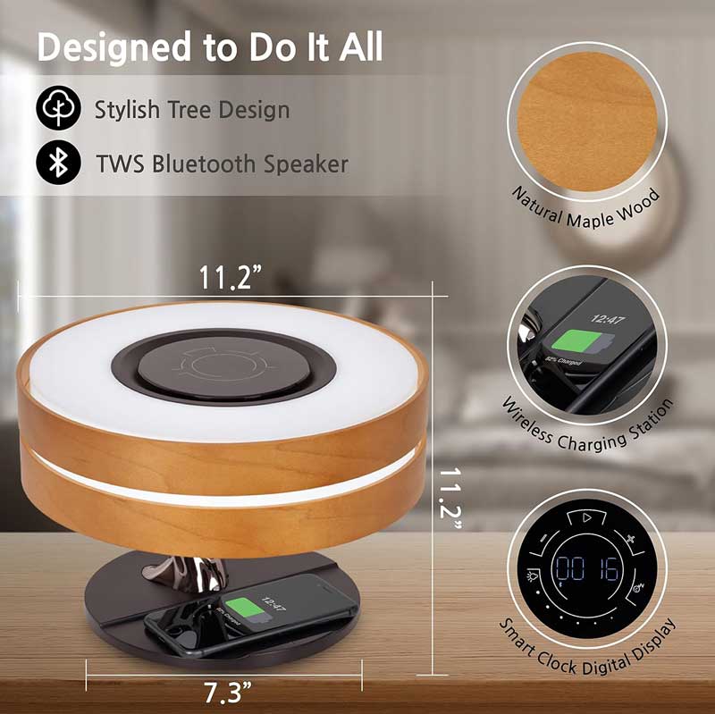 It features a built-in Bluetooth speaker, so you can enjoy your favorite music wirelessly, filling your room with rich, immersive sound. Tredo also combines a wireless charging pad to ensure that your devices stay powered up and ready to go, eliminating the hassle of tangled cords and cluttered desks.